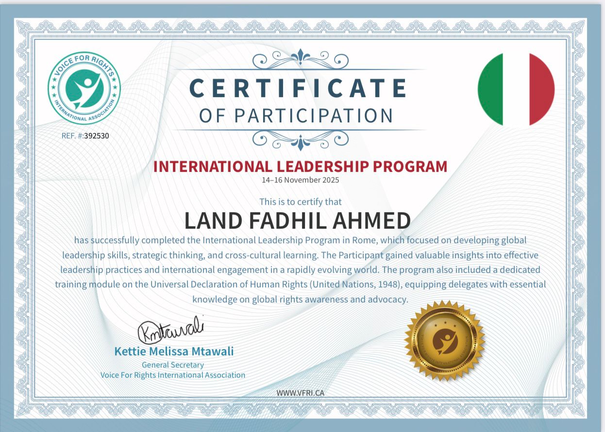 We are pleased to share that Land Fadhil Ahmed, a 4th-year Anesthesia student at Cihan University – Sulaimaniya, participated as an official delegate at the VFRI Youth Conference held in Rome, Italy